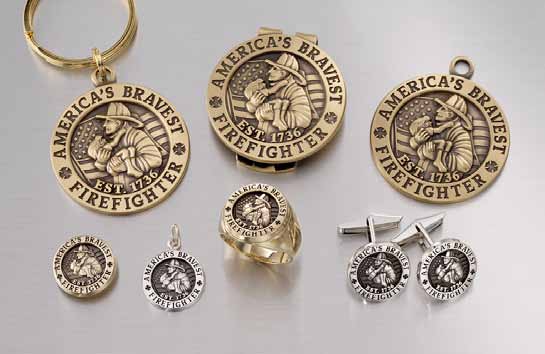 “America’s Bravest,” a designation loosely inspired by Brandon Tolberts’ poem, now has become a widely used tagline for heroism by firefighters. Dion’s America’s Bravest jewelry program consists of signet style rings which may be customized via laser engraving on the shanks, as well as an accessory line consisting of key ring, charm, money clip and cufflinks. Self-mailing order forms were sent to station houses or to individual fire fighters for ordering.