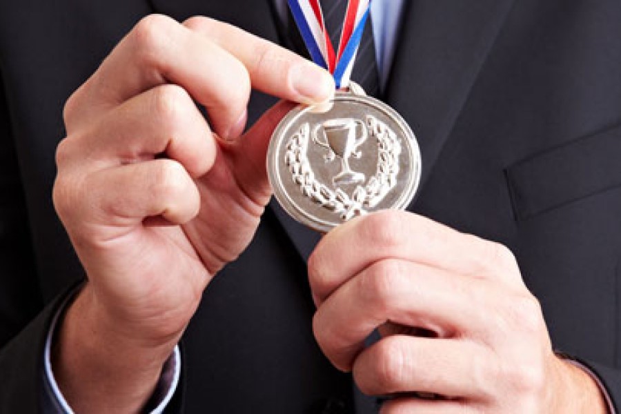 Made of a hard base metal (often brass) with a bonded layer of karat gold on top. This is an excellent way to obtain a gold precious metal award item without the expense of 10K or 14K gold. 10K or 14K gold sheet is bonded through a soldering process or mechanically bonded through extreme pressures to a base metal substrate. It is rolled repeatedly to obtain the desired thickness and percentage of gold required.