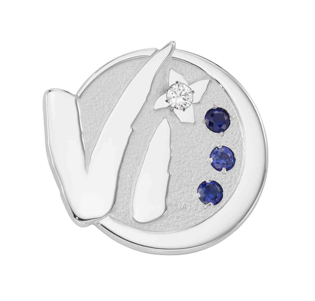 Vi wanted to honor those who go above and beyond at their retirement communities with this striking pin. The logo breaks free from the circular frame, and the "I" is dotted with a diamond. Blue sapphires add the company colors and accent the logo.